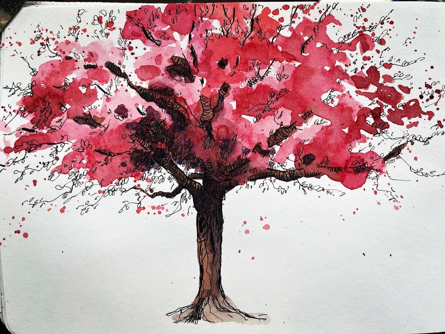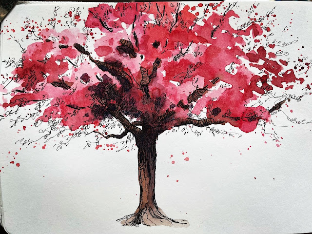 I painted the pink flowers, brown tones of the trunk and branches on location. Line work and shadows were added later, at home in front of the heater, while my fingers and toes thawed out.