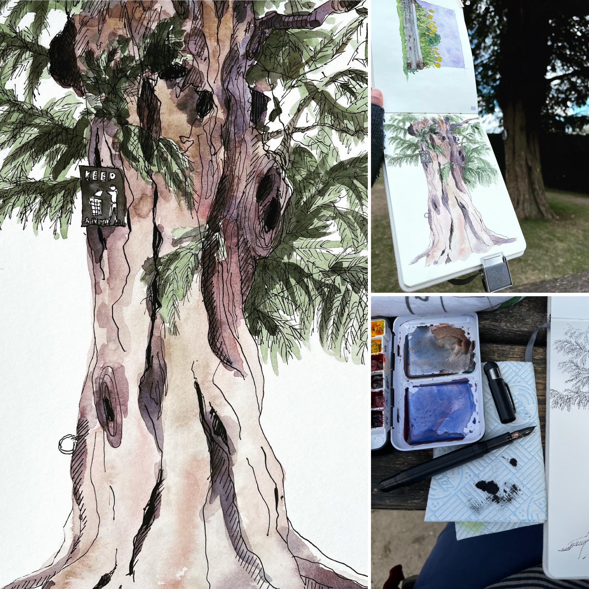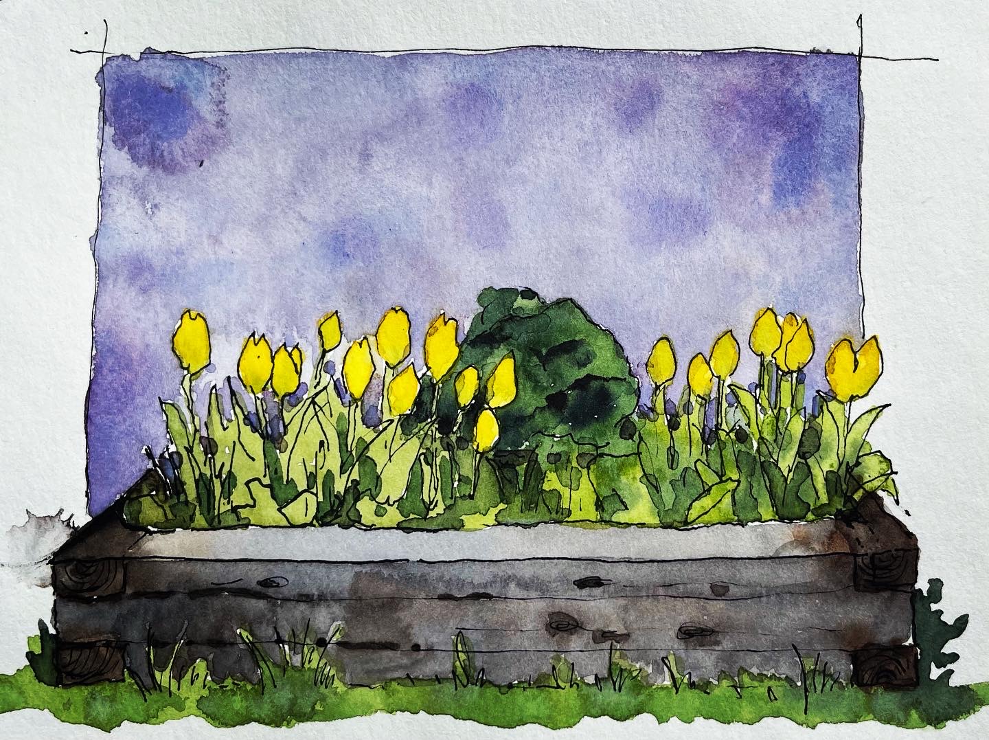 Another chilly day at my local park. I sat with a hot coffee and a warm buttered rock-cake, and sketched, while Harindra went off on his walk. Most of the spring blooms are gone now, aside from a bed of tulips,