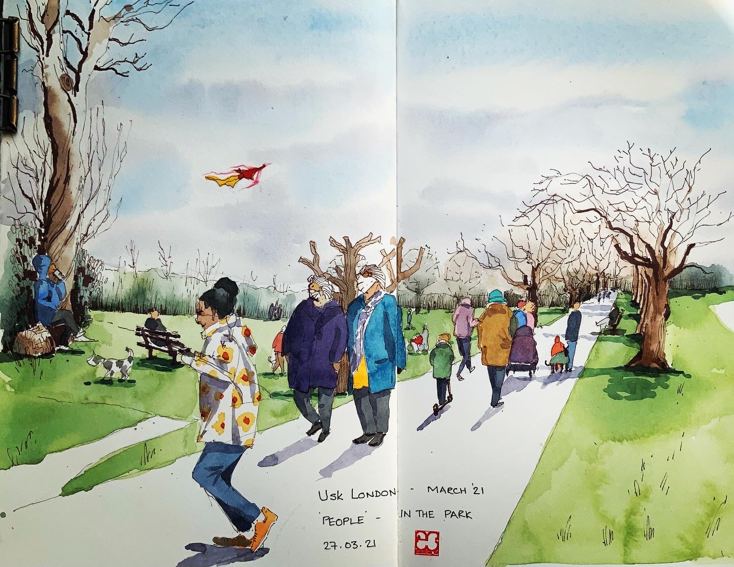 Urban Sketchers London held their second online sketch meet up via Zoom. Today’s theme was ‘people’, led by John Webb. I decided to sit on my local park bench to sketch people on this freezing but deceptively sunny day.