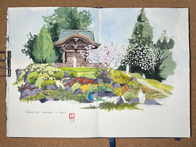I met up with a sketching buddy today, Zane (@zanekarklina). I’ve been looking forward to venturing out after the ‘stay at home’ restriction lifted in England. We spent Good Friday at Royal Botanic Gardens Kew sketching the Japanese landscape. It’s a beautiful space combining 3 different gardens – Garden of peace, Garden of Activity and Garden of Harmony – surrounding the Chokushi-Mon (Gateway of the Imperial Messenger). The resident peacock was out sunbathing (and posing for the tourists) in the Garden of Harmony among its neatly clipped hedges of Rhododendron and rock outcrops.